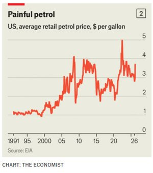 Just as they turned away, however, its eye twitched open. America’s and Israel’s war against Iran has disrupted energy markets once again. Even as Donald Trump seeks to soothe markets by saying hostilities could end soon, flows of oil through the Strait of Hormuz remain perhaps 97% below normal levels. Outmatched by its enemies on the battlefield, the Islamic Republic has retaliated by bombing natural-gas plants across the region. Energy prices have soared. The price of Brent crude is around $100 a barrel (albeit jumping about), up from $60 at the start of the year. American petrol prices have risen (see chart 2).