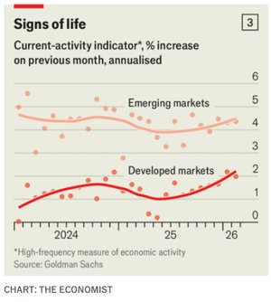 Moreover, the world economy came into the energy crisis in decent nick. Real wages across advanced economies are growing by at least 1% a year. In the fourth quarter of 2025 global corporate earnings rose by 15% in nominal terms, compared with a year earlier. A range of real-time data suggests that in recent months growth in the rich world has picked up (see chart 3). Despite the gyrations in energy markets, few investors are panicking about a recession. Measures produced by Goldman Sachs, a bank, which combine analysis of equities, foreign exchange and other assets, suggest that investors are pricing in a mild slowdown, not recession.