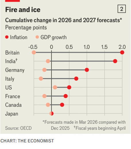 Broadly, the governments whose borrowing costs have jumped highest are those most exposed to inflationary pressure from the closure of Hormuz. The OECD produces regular forecasts of growth and inflation for its members, most of which are well-heeled countries. Comparing the last two sets, published in December and March, gives a picture of how their prospects have been changed by the Iran war (see chart 2).